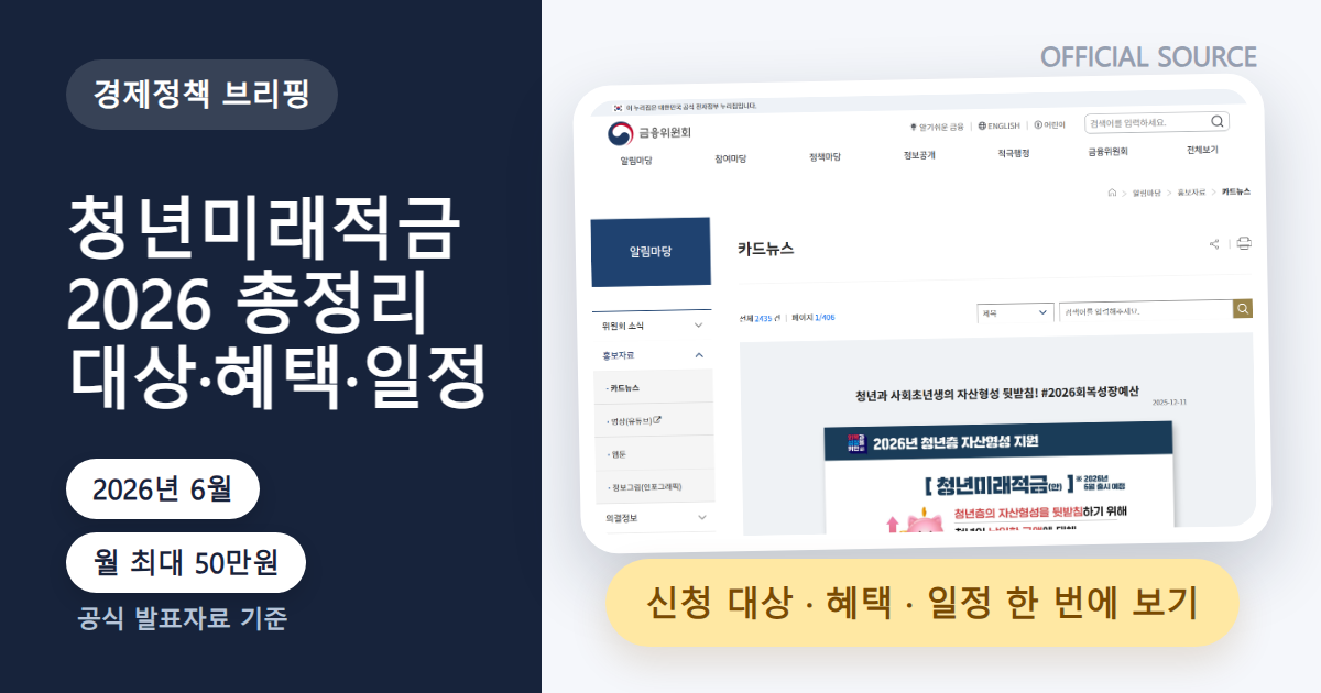청년미래적금은 2026년 6월 출시 예정인 청년 자산형성 정책상품입니다. 월 최대 50만원을 자유롭게 납입하고, 조건에 따라 정부기여금과 비과세 혜택을 받을 수 있다는 점이 핵심입니다.