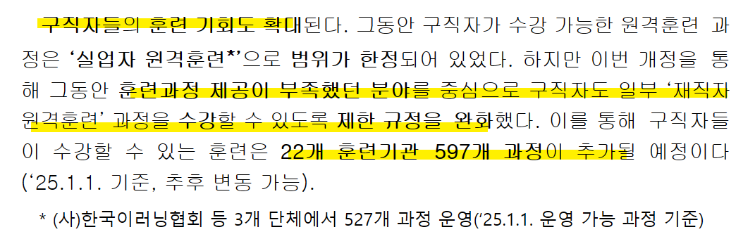 기존에 실업자 전용으로 제한됐던 원격훈련이 이제는 구직자도 일부 재직자 과정을 수강할 수 있도록 변경되었어요. 이로 인해 22개 훈련기관, 597개 이상의 다양한 교육과정이 추가되어, 변화하는 노동시장에 발맞춰 최신 기술과 직무 역량을 쌓을 수 있는 기회가 마련되었습니다.